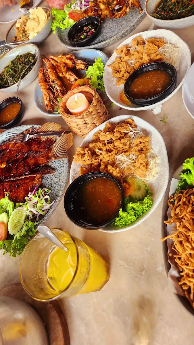 One word to describe this restaurant: STUNNING! We discovered it on TikTok and decided to give it a try and it truly lived up to the hype. The food is reasonably priced, especially for a group of four. We ordered the dancing fish, two types of indonesian salad, squids and were impressed by the generous portions. Considering the ambiance and overall experience, it's definitely great value for money. One unique feature is a small boat ride available for customers on a man-made water area, adding a fun and relaxing touch to the visit. If you're visiting Jakarta, this cafe is a must-try. What you see online is exactly what you get an amazing, well-designed place. From the moment you arrive, the creative decor at the reception makes a big impression. The small huts with floor seating, which added an authentic local feel. We were there for a birthday celebration, and the staff made it special by singing and playing traditional instruments. The service was outstanding the waiters were friendly, helpful, and very courteous. They deserve tips for the super-fast service, our entire meal was served within 15 minutes! Highly recommended for anyone looking for a beautiful dining experience in Jakarta.